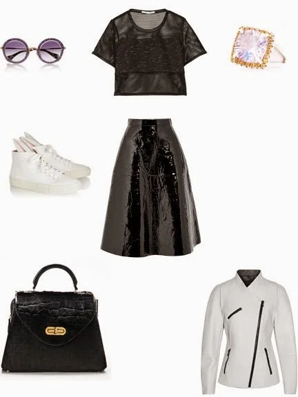 Hello everyone! My anticipation for Fall can barely be contained at this point. I get a twinge of excitement when I stumble upon apple cider and painted gourds in the grocery store, and the return of pumpkin spice lattes is practically enough to make the leaves change. Fall is also a wonderful time for us fashion lovers. It signifies that you can finally wear cute jackets and jeans without bathing in your own sweat! This fall, I am really excited to play around with heavier fabrics like neoprene and brocade. I am also loving the sporty-chic revolution, combining feminine skirts with sleek sneakers. My sporty-chic fashion board focuses on texture and shine as opposed to colors. Exploring new fabrics and shapes is a great way to mix up your look, and can be just as interesting as wearing bright colors. I paired a semi-sheer crop jersey top with a flared patent leather skirt. A fitted white jacket with abstract zipper features defines this look and makes it Fall-ready!