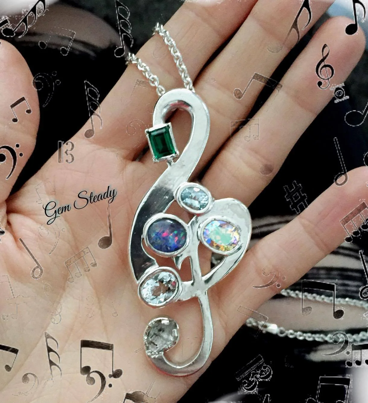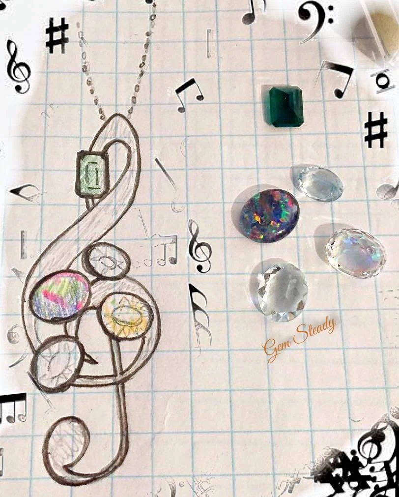 A client brought us the gemstones pictured above. She shared that the stones were collected by her late son and that she would like a pendant made using them. Not set on any particular design, we spent a little time going over some options and exploring possibilities. It was not until a few days later that I received an email from her suggesting the treble clef. Her son was a musician, so it seemed like a fitting symbol to commemorate.